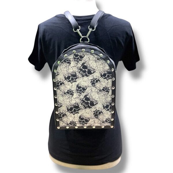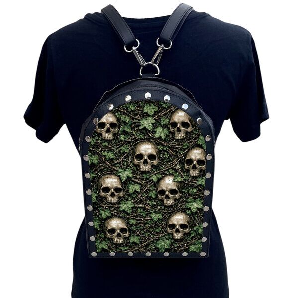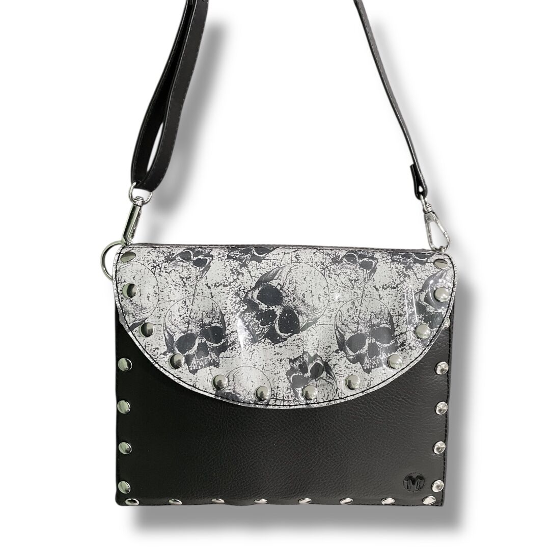 Borsa cartella con rivetti e fantasia teschi con foglie.