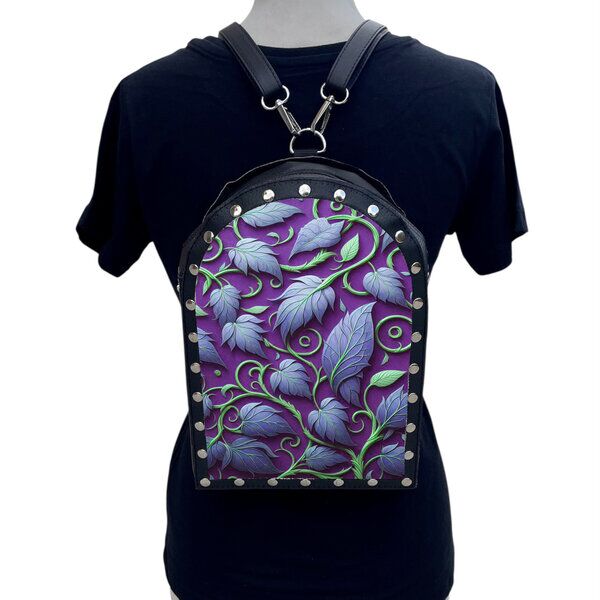 Borsa in similpelle e fantasia plastificata con rose gotiche viola e spine.