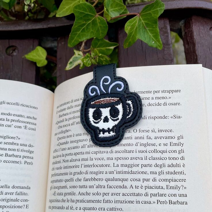 Segnalibro magnetico in similpelle con teschio assonnato e caffè.